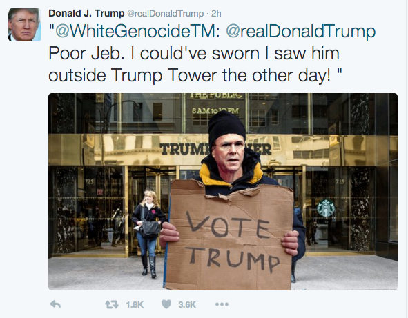 The candidate was criticized for the retweet, which depicted a photoshopped image of Jeb Bush as a homeless man standing outside a Trump Tower, holding a "Vote Trump" sign. The campaign has neither addressed the tweet, nor taken it down at press time.